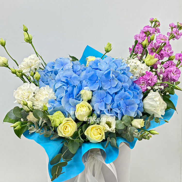 Гортензии, маттиолы и эустомы в коробке