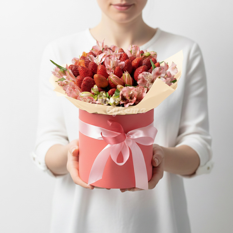 Клубника с альстромериями в коробке