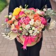 Розовый букет из пионов, роз и маттиол