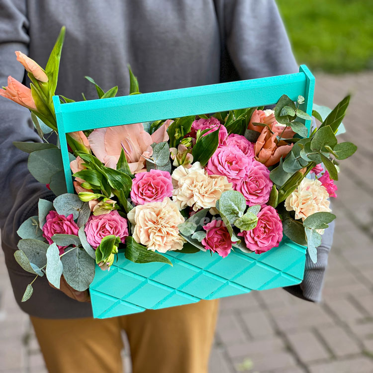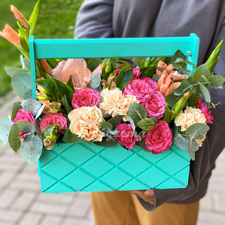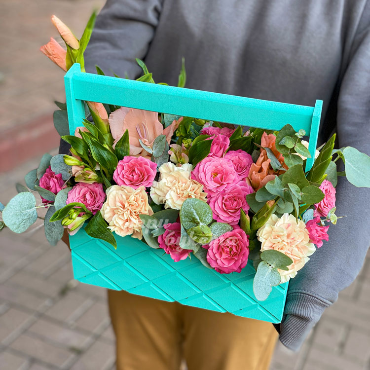 Розы и гвоздика в ящичке