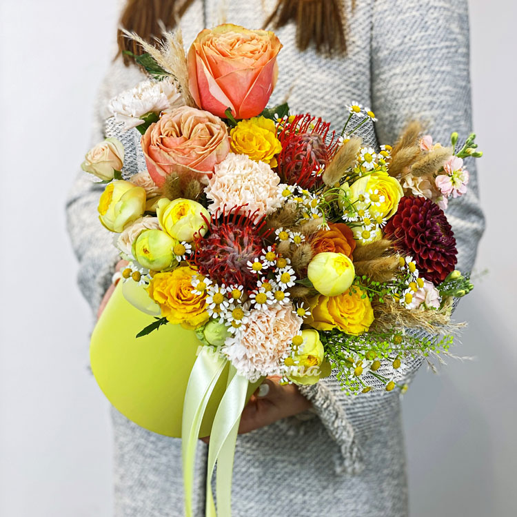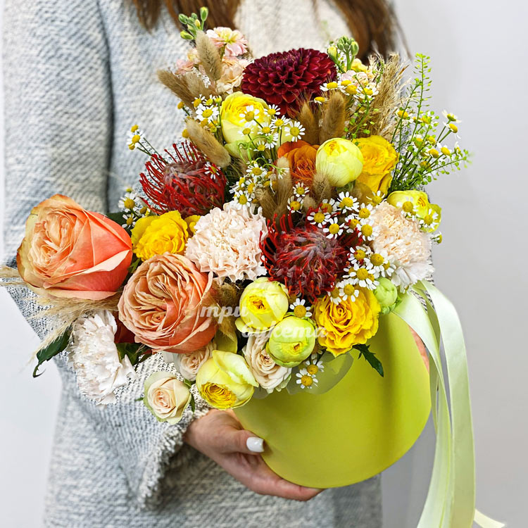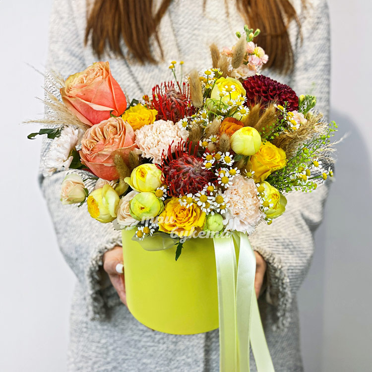 Желтая коробка с розами, протеями и заленью