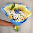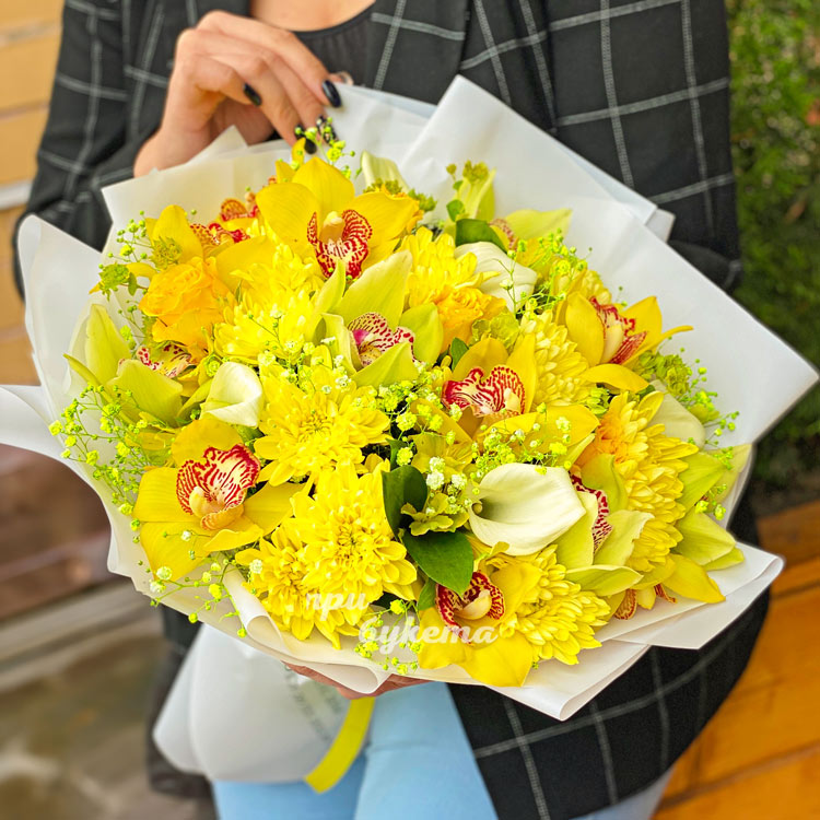 Желтые орхидеи и хризантемы в букете
